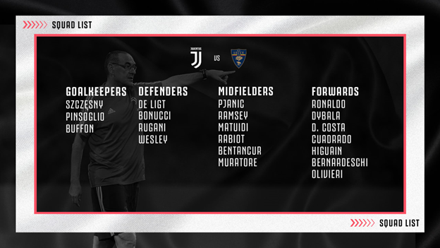 به گزارش باشگاه طرفدارن رسمی یوونتوس –لیست بازیکنان برای بازی مقابل لچه به شرح زیر می باشد:
