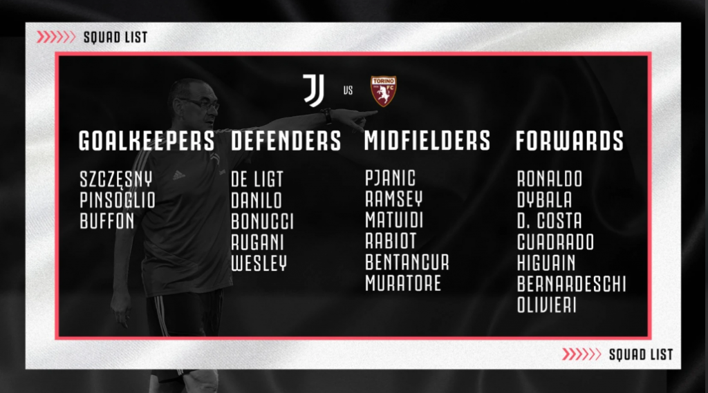 به گزارش باشگاه طرفدارن رسمی یوونتوس – مائوریتزیو ساری لیست بازیکنانی را که در دربی دلا موله در برابر تورینو به میدان خواهند رفت را اعلام کرد. بازی روز شنبه ساعت 19:45 به وقت ایران در استادیوم آلیانز برگزار خواهد شد.