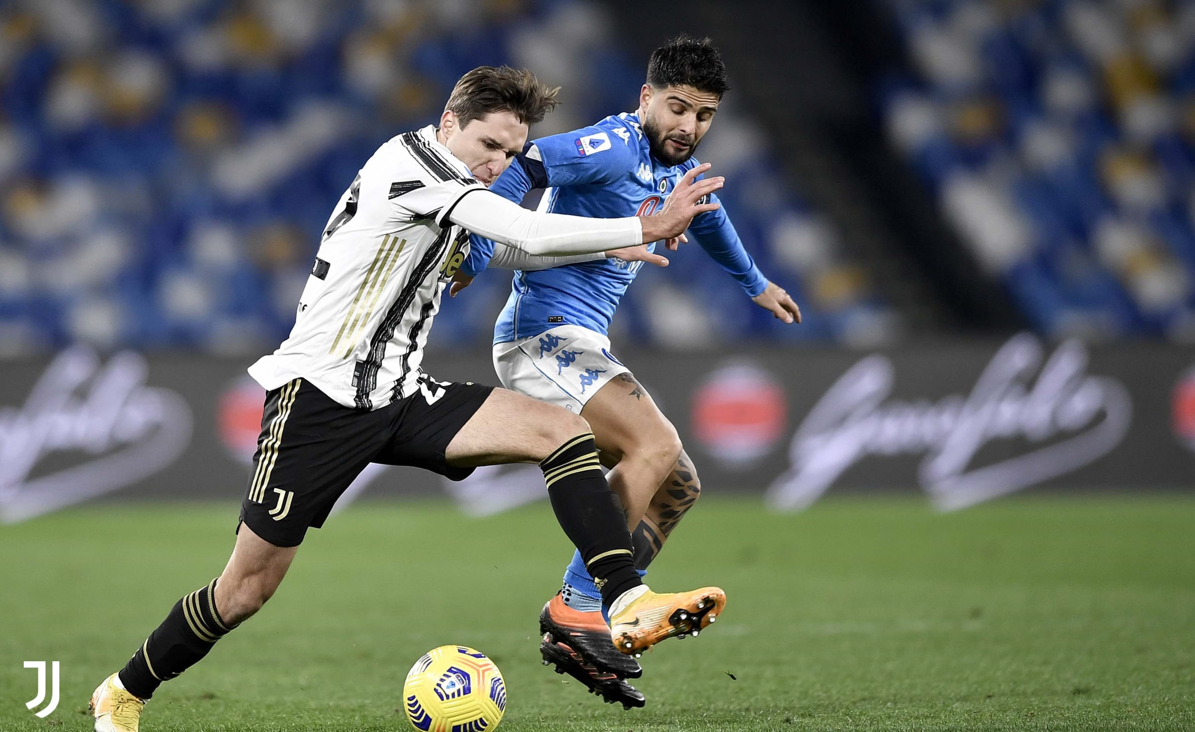 هر دو تیم بازی را با تلاش برای پرس کردن حریف و فهمیدن تاکتیک های تیم مقابل آغاز کردند و این سبب شد که ۲۵ دقیقه ی اول بازی تا حد زیادی متعادل دنبال شود و موقعیت های کمی ایجاد شوند. سپس ناپولی پس از مشورت داور با VAR، در دقیقه ی ۳۰ روی خطای کیلینی و ضربه ی دست این بازیکن به صورت رحمانی صاحب یک ضربه ی پنالتی شد. لورنزو اینسینیه از روی نقطه ی پنالتی دروازه را باز کرد و توپ را به زیر طاق دروازه فرستاد. این بازیکن ایتالیایی سپس با پست سر گذاشتن دلیخت وارد محوطه ی جریمه شد اما کیلینی با حضور و حمایت به موقع خود تلاش او را ناکام گذاشت. ضربه ی کیه زا از بالای تیر افقی دروازه به بیرون رفت. نیمه ی اول پس از برخورد ضربه ی آزاد رونالدو به دیوار دفاعی به پایان رسید.