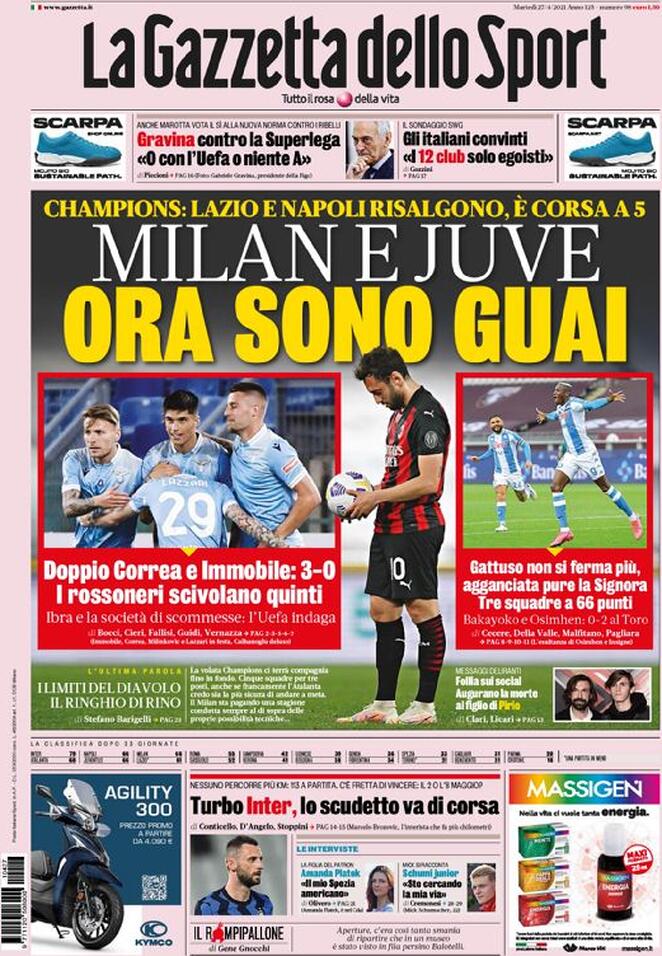 یووه و میلان، آنها اکنون دچار مشکل هستند – قهرمانان: “لاتزیو و ناپولی دوباره صعود می کنند” – دبل کوریا و تک گل ایموبیله، روسونری را به رتبه ی پنج فرستاد – گتوزو متوقف نمی شود: باکایوکو و اوسیمهن؛ ۲ بر ۱ برابر تورینو – سه تیم با ۶۶ امتیاز