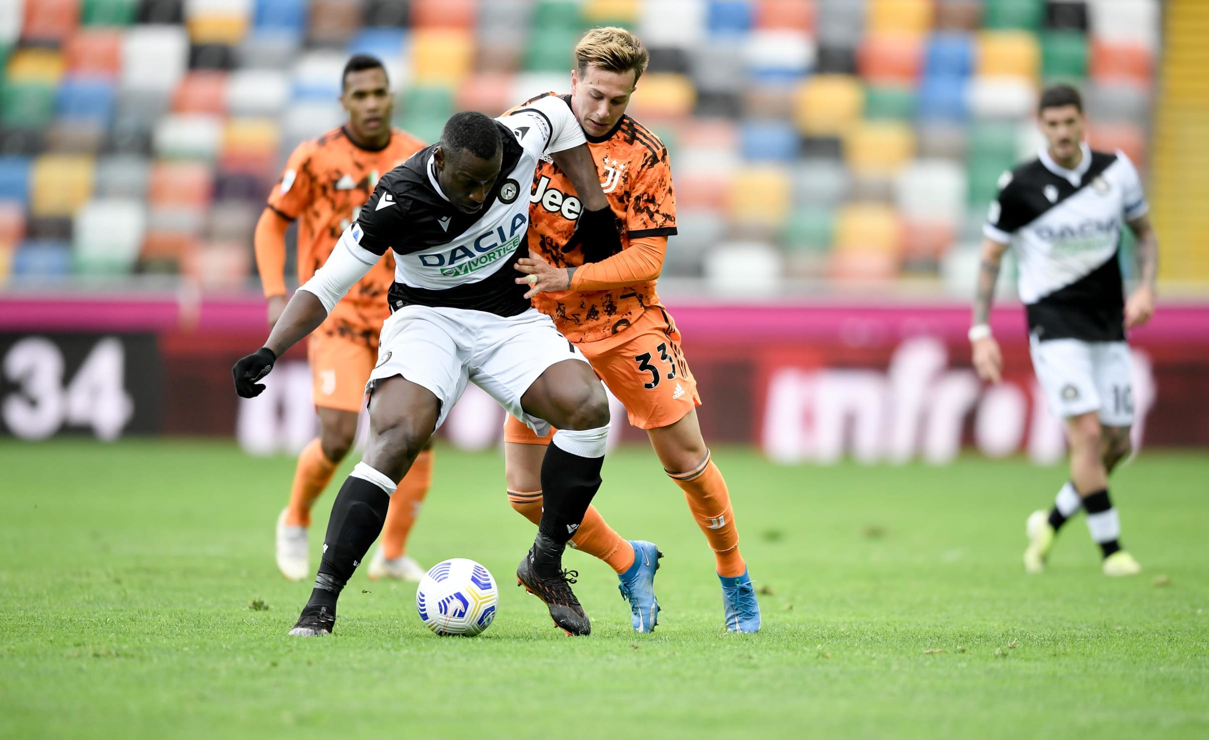 اودینزه فقط پس از گذشت ۱۰ دقیقه از بازی جلو افتاد ، وقتی که با یک ضربه آزاد که سریعاً به بازی در آمد بیانکونری را غافلگیر کرد، مولینا از سمت راست جلو رفت و با یک ضربه پر قدرت توپ را از کنار دستان شزنی به درون دروازه یوونتوس فرستاد. موقعیت های گلزنی ایجاد نمی شد، هر دو تیم به ندرت دروازه بان رو به روی خود را آزمایش می کردند. اولین فرصت بیانکونری در این بازی در دقیقه ی ۲۷ اتفاق افتاد هنگامی که ضربه ی سر مک کنی روی سانتر ارسالی کوادرادو از روی نقطه ی کرنر به شکل خطرناکی از کنار دروازه به بیرون رفت. سپس دلیخت اقدام به شوت زدن به سمت دروازه کرد اما توپ او راه به جایی نیافت، دلیخت پس از آن توپ یا یک سانتر توپ را به رونالدو در داخل مخوطه ی جریمه رساند اما ضربه ی سر او به آرامی از بالای دروازه عبور کرد.
