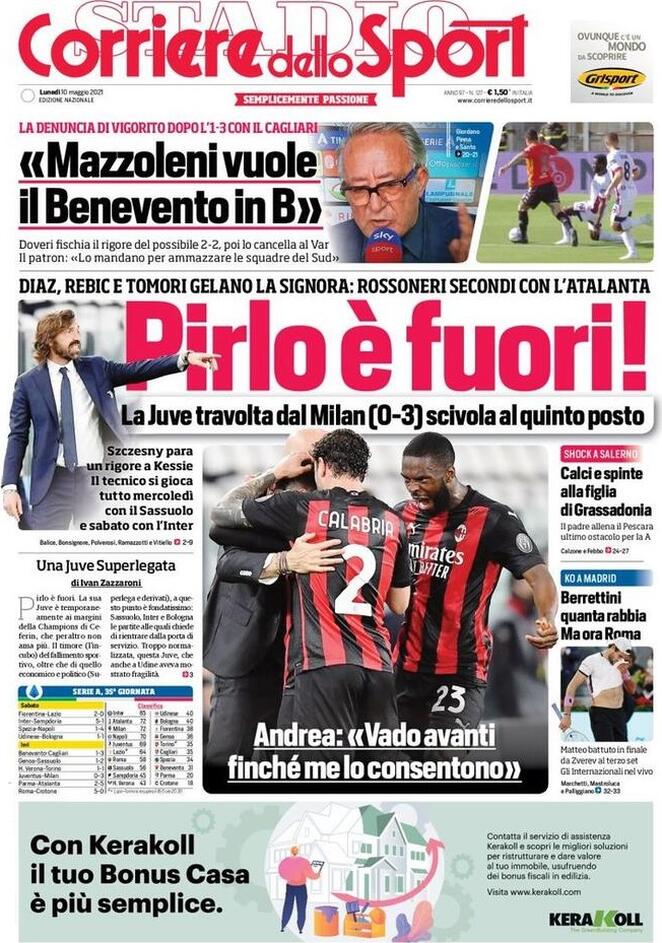 بیانکونری خارج از منطقه ی قهرمانان – “پیرلو بیرون است” – یووه غرق در نتیجه ی ۰-۳ برابر میلان، به جایگاه پنجم جدول سقوط کرد – آندره آ پیرلو: “من تا زمانی که اجازه دهند به کار خود ادامه می دهم” – این سرمربی چهارشنبه با ساسولو و شنبه با اینتر بازی خواهد کرد – دیاز، ربیچ و توموری بیانکونری را متوقف کردند، روسونری همگام با آتلانتا – شزنی، پنالتی کسیه را مهار کرد.