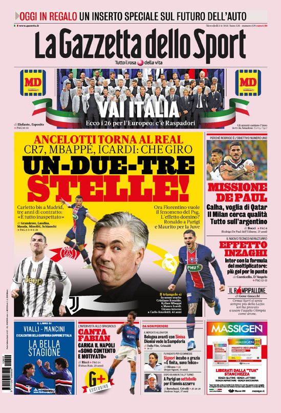 به گزارش وبسایت باشگاه طرفداران رسمی یوونتوس ایران – تیتر اول روزنامه های چاپ ایتالیا در تاریخ ۲ ژوئن ۲۰۲۱ – ۱۲ خرداد ۱۴۰۰ به شرح زیر است: