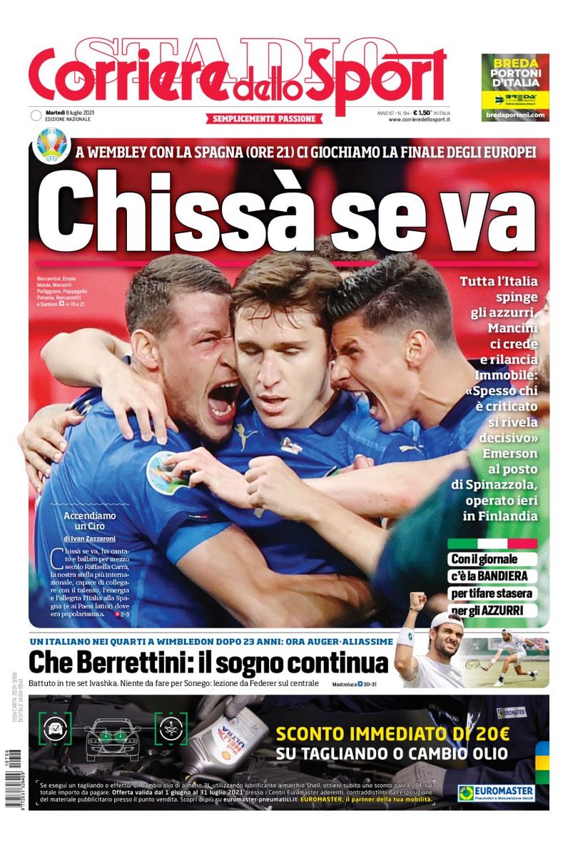 بازی اول مرحله ی نیمه نهایی رقابت های یورو ۲۰۲۰؛ ساعت ۲۱:۰۰ به وقت محلی در ورزشگاه ومبلی لندن: ایتالیا – اسپانیا – تمام مردم ایتالیا آبی پوشان آتزوری را تشویق می کنند – مانچینی به ایموبیله اعتماد دارد و او را در نوک پیکان خط حمله ی آتزوری قرار خواهد داد – مانچینی: “اغلب اوقات کسانی که مورد انتقاد قرار می گیرند انگیزه ی بیشتری پیدا می کنند” – امرسون پالمیری به جای اسپیناتزولا در ترکیب.