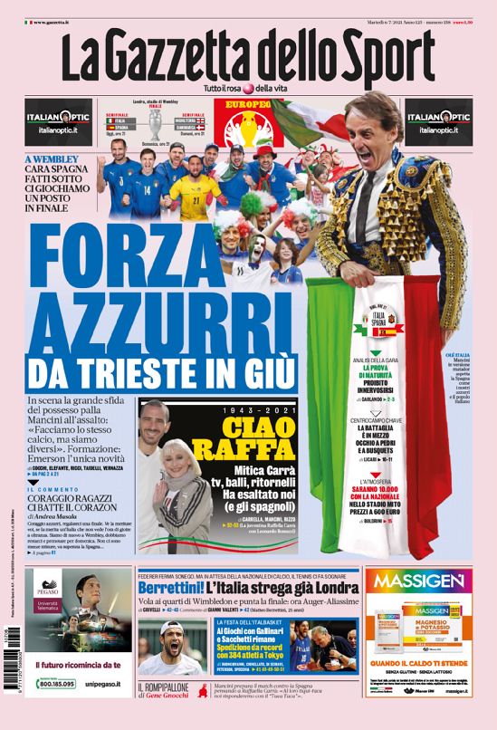 چالش آتزوری و اسپانیا در ورزشگاه ومبلی لندن برای صعود به فینال مسابقات یورو ۲۰۲۰ – چالش بزرگ بر روی مالکیت توپ – روبرتو مانچینی: ما و رقیب خود به شیوه ب یکسانی فوتبال بازی می کنیم اما با یکدیگر تفاوت داریم” – نبرد هافبک ها؛ “مراقب پدری و بوسکتس باشید” – امرسون جانشین اسپیناتزولا است – درگذشت رافائلا کارا کل ایتالیا را به شوک فرو برد.