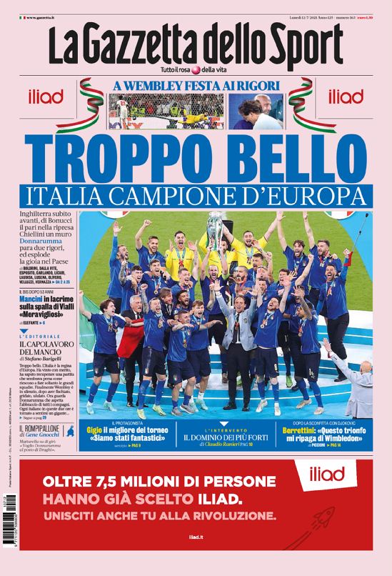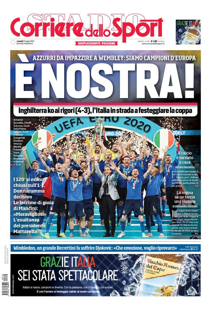 “این جام مال ما است!” – خوشحالی آبی پوشان آتزوری در ورزشگاه ومبلی لندن؛ “ما قهرمان اروپا هستیم!” – شکست سه شیر ها در ضربات پنالتی؛ ۴-۳ – جشن مردم ایتالیا در خیابان ها – در پایان ۱۲۰ دقیقه دوناروما تعیین کننده بود – اشک های مانچینی – سربلندی رئیس جمهور ماتارلا.
